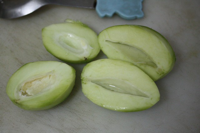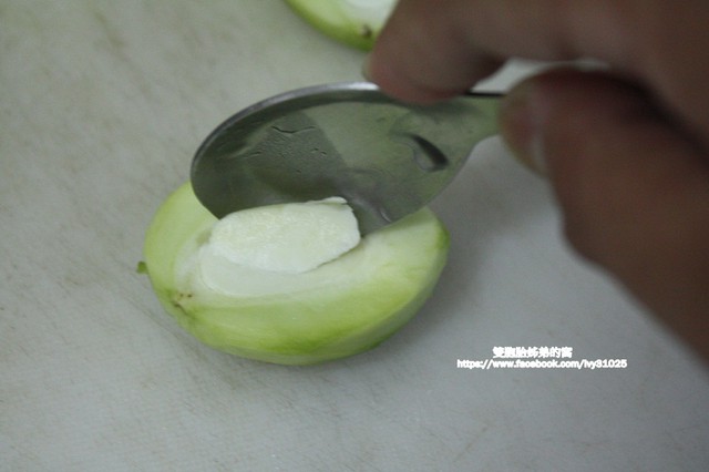再用湯匙挖掉青芒果果實的白色蕊心。