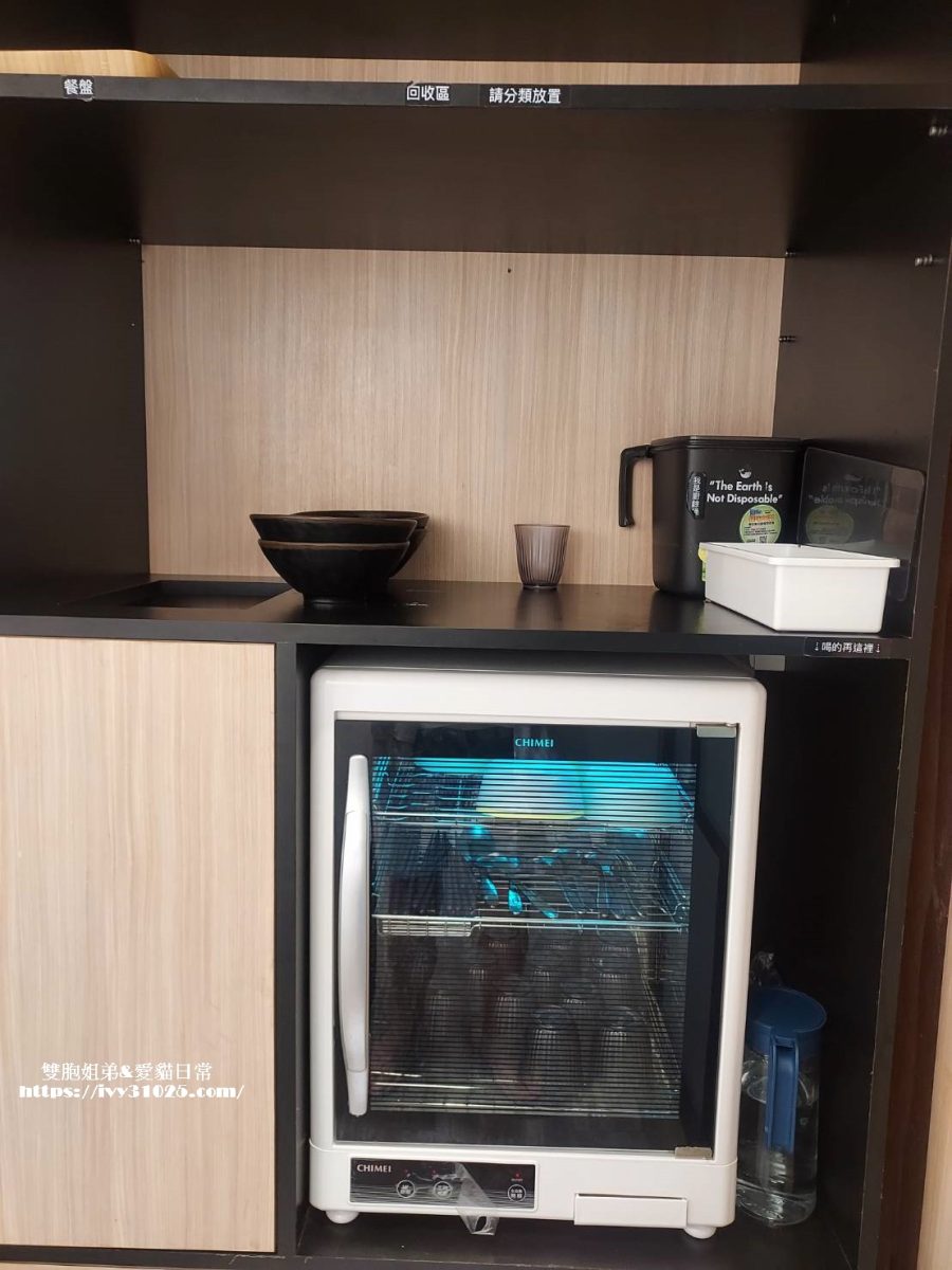 內用餐具都在最後面的高溫殺菌櫃子以外,自助式回收區就在上面,但請分類放置。